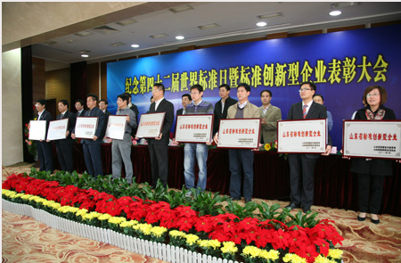 10月14日,山東省質(zhì)量技術(shù)監(jiān)督局、山東省經(jīng)濟(jì)和信息化委員會(huì)在濟(jì)南舜耕山莊聯(lián)合舉行紀(jì)念第42屆世界標(biāo)準(zhǔn)日暨全省標(biāo)準(zhǔn)創(chuàng)新型企業(yè)表彰大會(huì),共同慶祝第42屆世界標(biāo)準(zhǔn)日的到來(lái),并對(duì)評(píng)選出的山東省首屆標(biāo)準(zhǔn)創(chuàng)新型企業(yè)進(jìn)行表彰。受董事長(zhǎng)、總經(jīng)理康鳳明委托,集團(tuán)常務(wù)副總經(jīng)理潘憲平參加了此次表彰大會(huì)并上臺(tái)領(lǐng)取“山東省標(biāo)準(zhǔn)創(chuàng)新型企業(yè)”榮譽(yù)牌匾。
