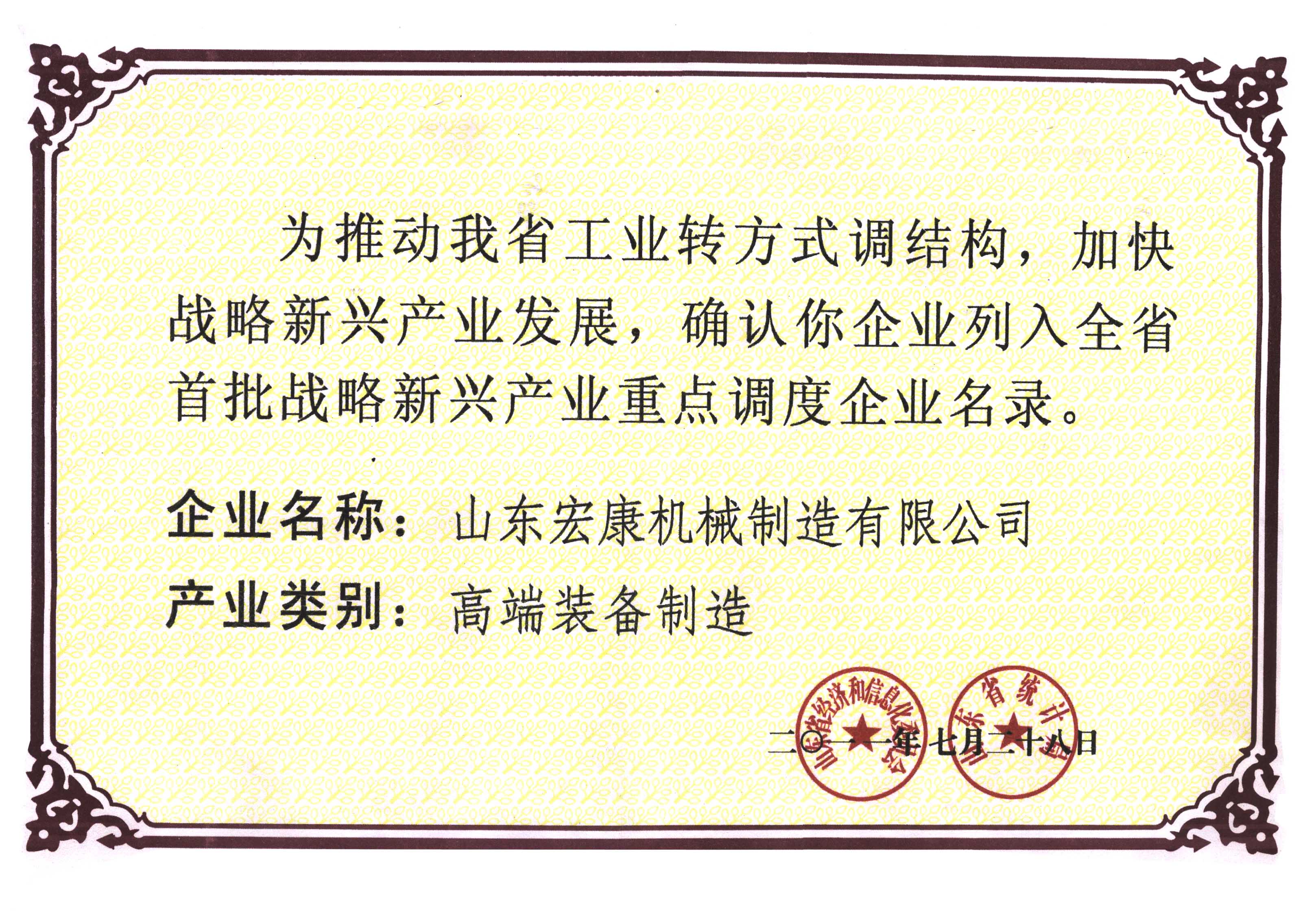 為認(rèn)真貫徹落實(shí)省委、省政府關(guān)于“十二五”期間加快發(fā)展戰(zhàn)略新興產(chǎn)業(yè)的重大決策部署,充分發(fā)揮戰(zhàn)略新興產(chǎn)業(yè)重點(diǎn)企業(yè)的引領(lǐng)和帶動作用,推動我省工業(yè)轉(zhuǎn)方式、調(diào)結(jié)構(gòu),提高經(jīng)濟(jì)運(yùn)行質(zhì)量和效益。經(jīng)公司申報,泰安市經(jīng)信委和統(tǒng)計局審核推薦,省經(jīng)信委、省統(tǒng)計局聯(lián)合審核認(rèn)定了全省254家首批戰(zhàn)略新興產(chǎn)業(yè)重點(diǎn)調(diào)度企業(yè),其中高端裝備制造企業(yè)33家,我公司名列其中。