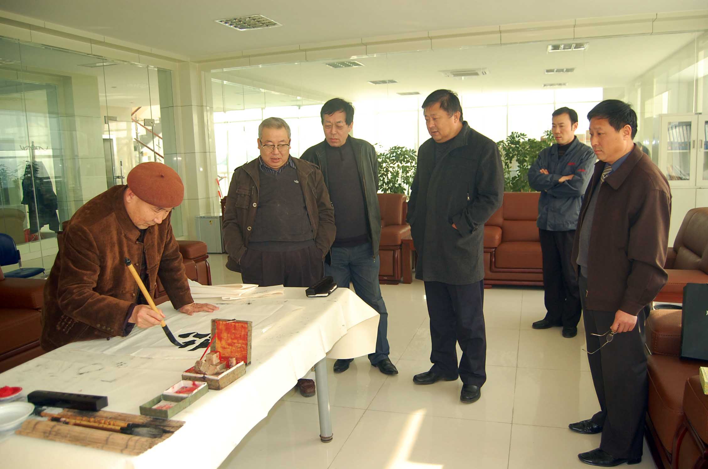 圖為公司董事長、總經(jīng)理康鳳明、副總經(jīng)理郭家榮等領導現(xiàn)場觀看耿老作書。